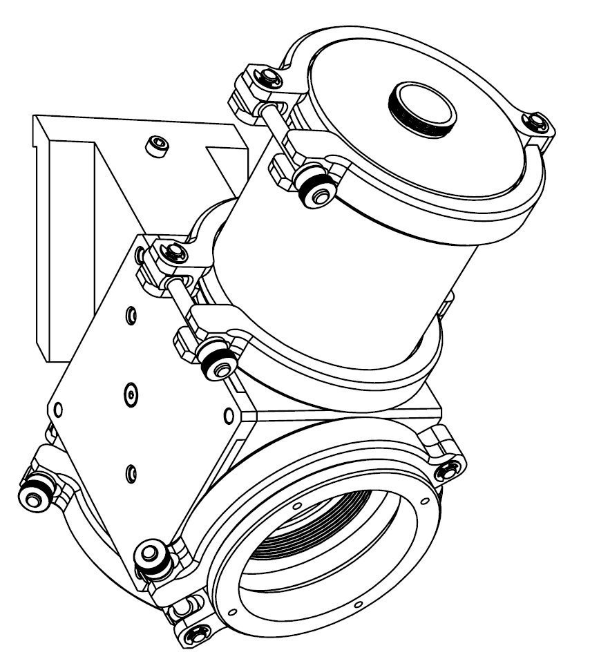 A rigid optomechanical assembly for mounting cameras, objective lenses, and dichroic mirrors for widefield microscopy (part ID #0170-000-00).
