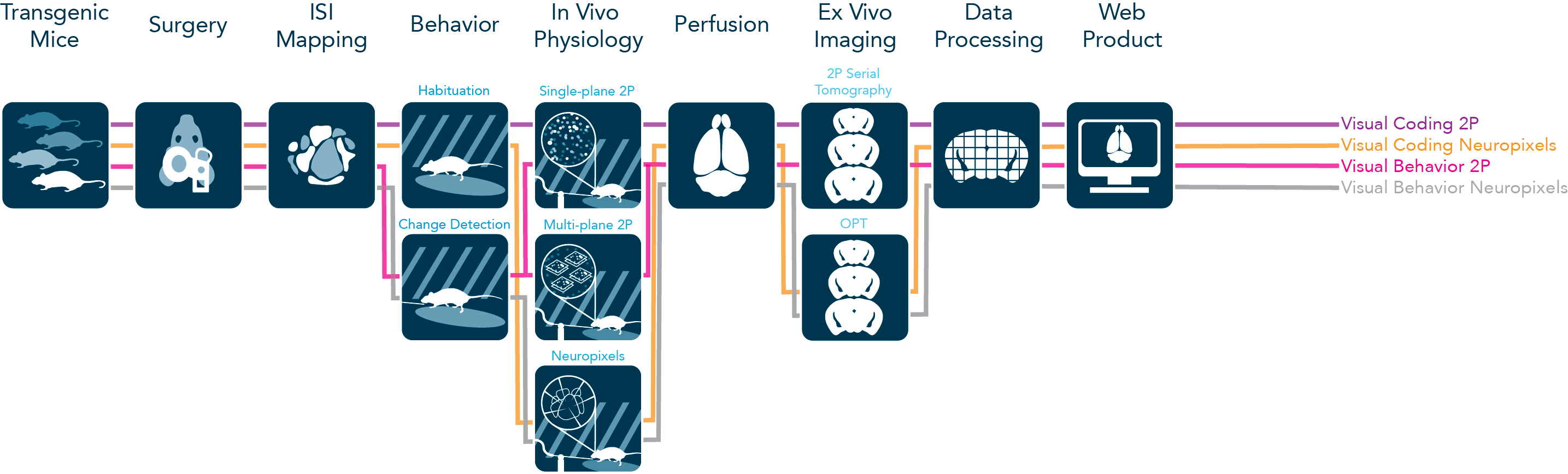 The Allen Brain Observatory presents the first standardized in vivo surveys of physiological activity in the mouse visual cortex. Dedicated teams carry out each step of the protocol as mice are prepared for experiments, cortical areas are mapped, and neural activity is recorded in response to a wide set of visual stimuli (schematized below)