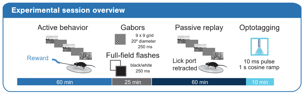 Every experimental session consisted of four major stimulus epochs as diagrammed below: 1) an active behavior epoch during which the mouse performed the change detection task, 2) a receptive field characterization epoch during which we presented gabor stimuli and full-field flashes, 3) a passive replay epoch during which we replayed the same stimulus frame-for-frame as the mouse encountered during active behavior, but now with the lick spout removed and 4) an optotagging epoch during which we stimulated the surface of the brain with blue light to activate ChR2-expressing cortical interneurons.