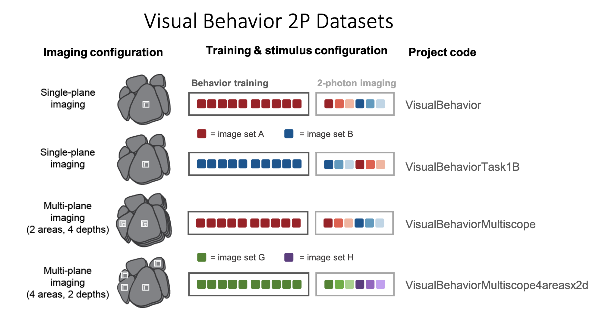 To allow analysis of stimulus novelty on neural responses, two different images sets were used in the recording sessions: G and H (diagrammed below). Both image sets comprised 8 natural images. Two images were shared across the two image sets (purple in diagram), enabling within session analysis of novelty effects. Mice took one of the following three trajectories through training and the two days of recording: