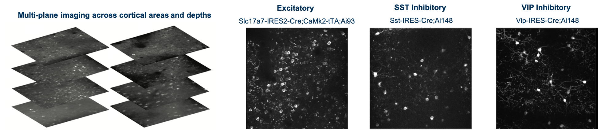 Using single- and multi-plane 2-photon calcium imaging in the visual cortex of transgenic mice expressing the calcium indicator GCaMP6f in populations of excitatory and inhibitory neurons, we have recorded neural activity during performance of a visual change detection task from 34,619 neurons in 551 in vivo imaging sessions. A key aspect of the experimental design is the repeated imaging of the same populations of neurons across multiple days, allowing analysis of single cell changes across behavioral and sensory conditions, including task engagement and stimulus novelty.
