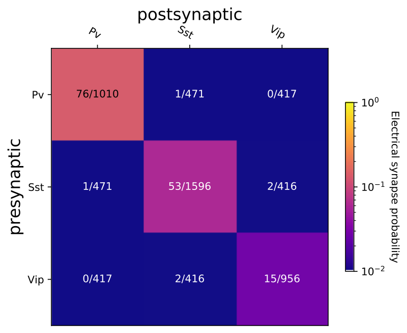 The three inhibitory interneuron subclasses, Pv, Sst, and Vip were also electrically coupled by gap junctions.