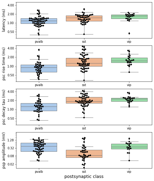 For each connection identified in our dataset we measure the latency, strength, and rise / decay kinetics. These values are mainly derived from curve fits to the averaged responses from both current and voltage clamp recordings. With these results one can make comparisons of kinetic parameters across cell types or construct models with biophysically realistic synapse properties.