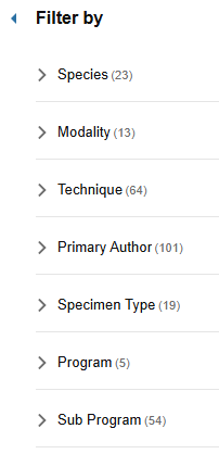 Scientists can filter for relevant projects across species, modality, technique, primary author, specimen type, program, and sub program.