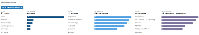 An interactive dashboard summarizing the available data. It allows scientists to access all projects from a given project in the BKP’s Data Catalog, e.g. 104 BICCN projects.