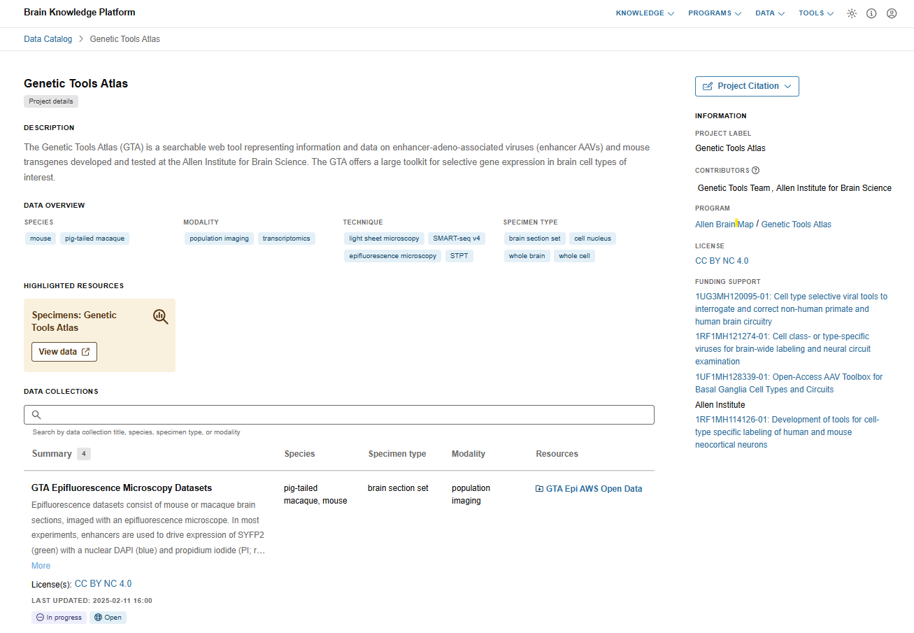The Genetic Tools Atlas (GTA) is a searchable web tool representing information and data on enhancer-adeno-associated viruses (enhancer AAVs) and mouse transgenes developed and tested at the Allen Institute for Brain Science. The GTA offers a large genetic toolkit for selective gene expression in brain cell types of interest.